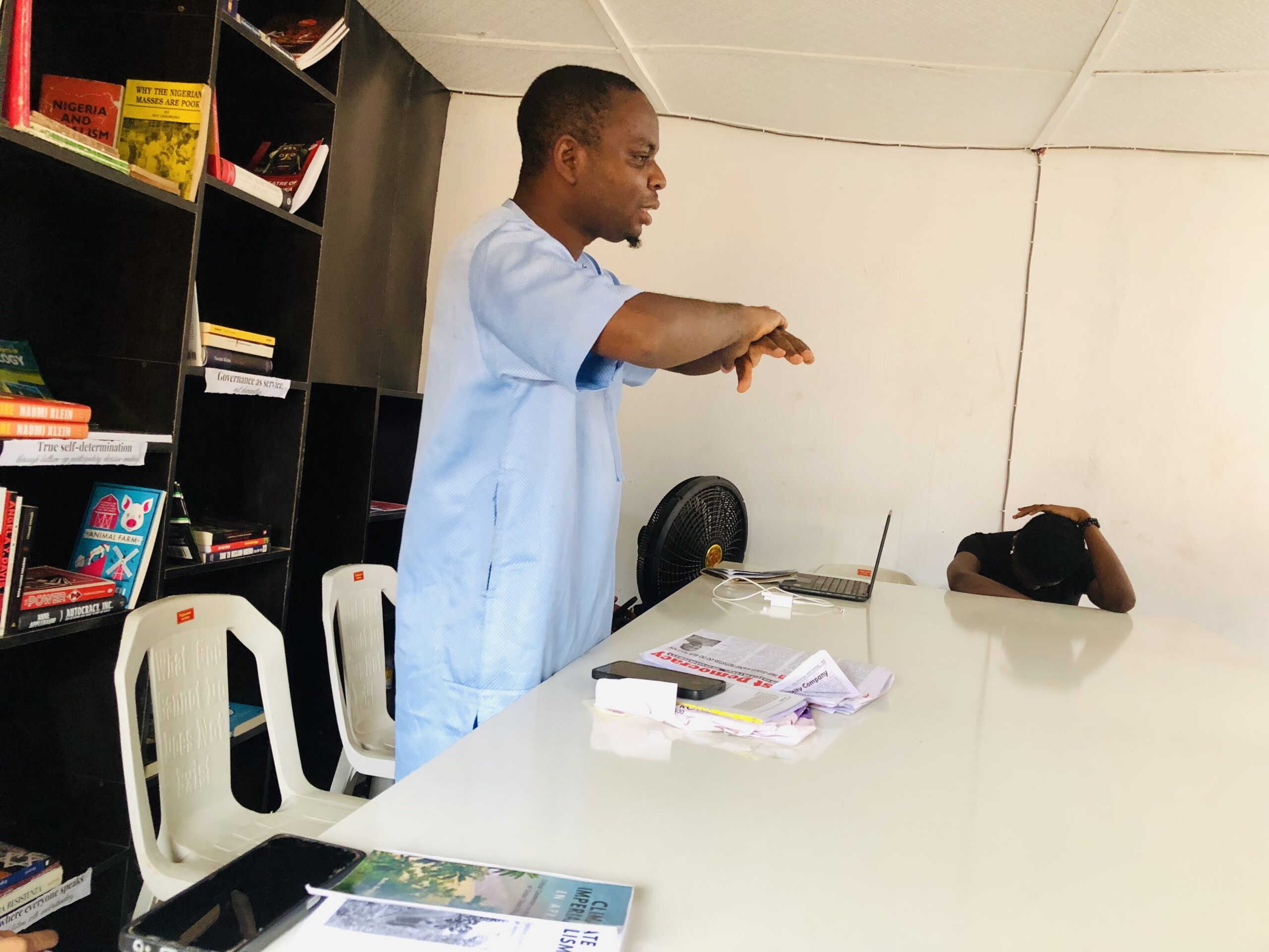 THE FIGURE Workspace and Bookspace at OAU Campus Gate, Ile-Ife, Nigeria on Friday March 7 held a book review in collaboration with Indigenous associations from the Obafemi Awolowo University campus. The event which had at least 15 students, socialists and book enthusiasts in attendance commenced at about 4pm with an introduction of the organization FIGURE Workspace and Bookspace by the Project Manager, Comrade Omole Ibukun who stresses the political significance of a space a low-cost solar-powered workspace for students that can bring them in contact with books about alternative political views that are not often taught in schools. He emphasized the need for a new generation of activists and introduced the book under review—Climate Imperialism in Africa by Comrade Kola Ibrahim.